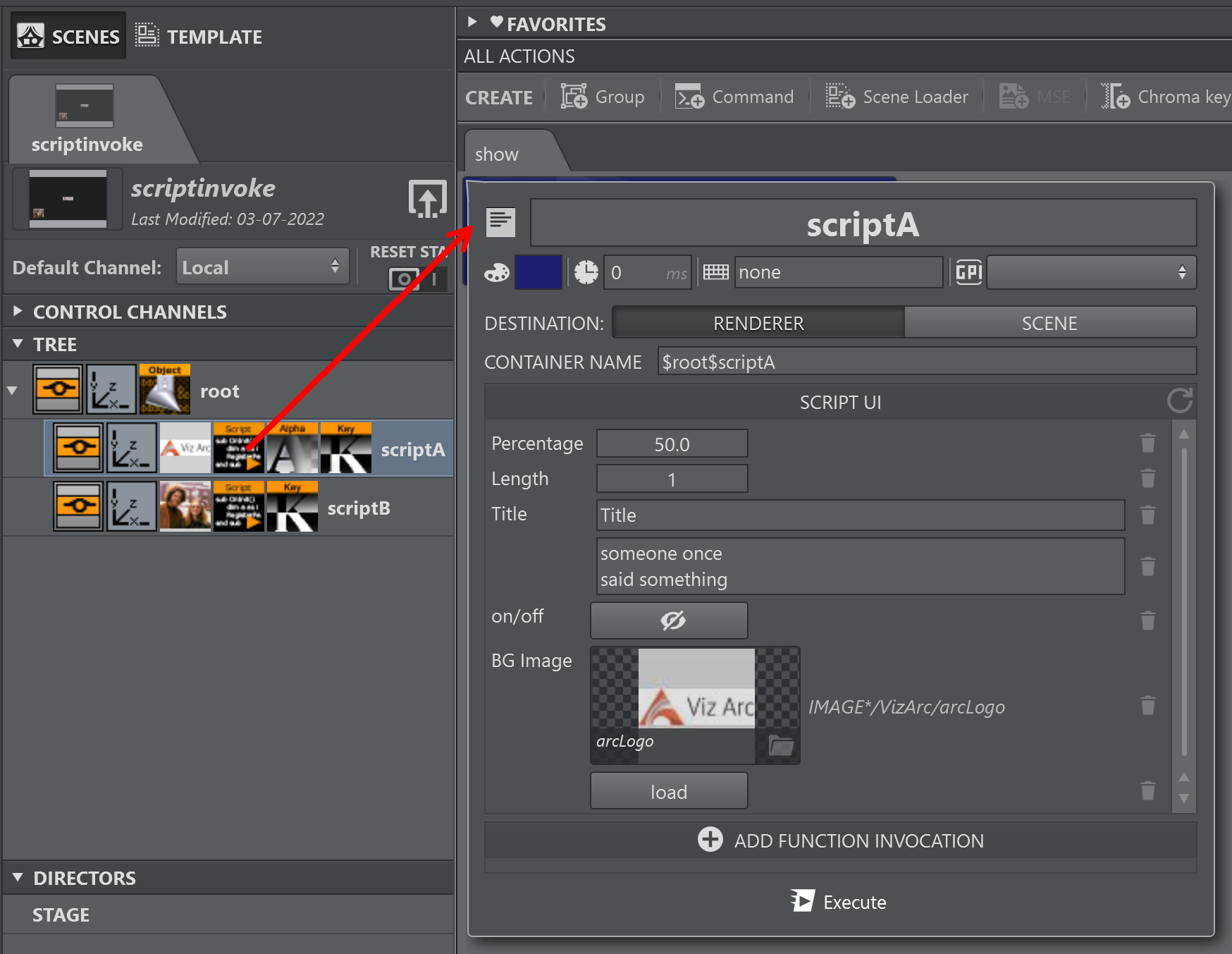 On execution of the Script Action, all UI parameter values and function invocations listed in the action are sent to the selected channel's Viz Engine(s).