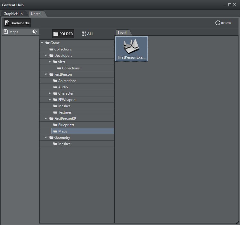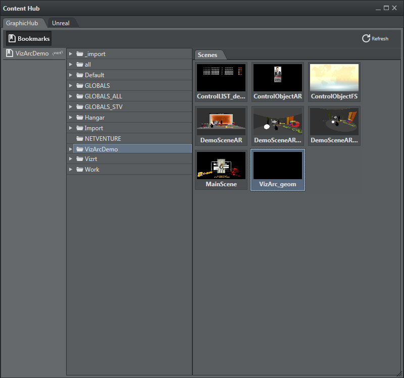 This opens the Content Hub window, where you can choose between Vizrt GH scenes or Unreal levels: