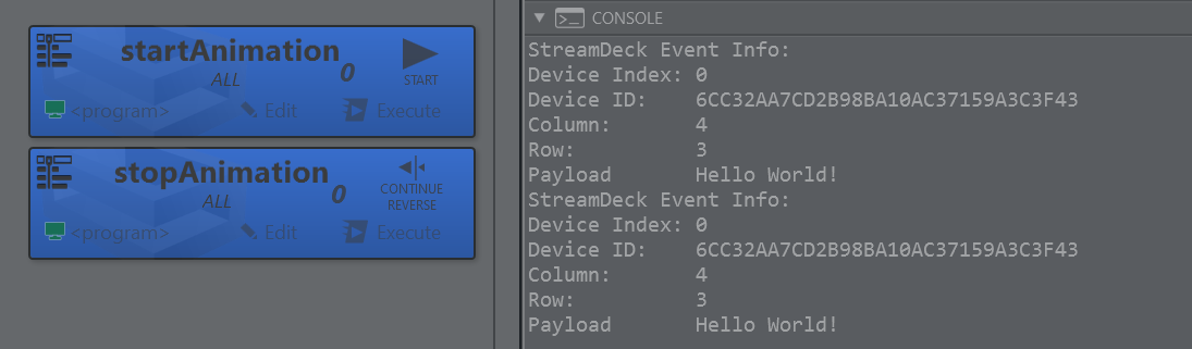 The script above executes the startAnimation action when the Stream Deck button is pressed and the stopAnimation action when the button is released.
