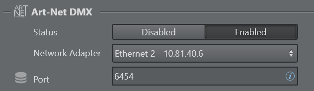 The Art-Net section is used to configure the listening port and interface for Art-Net DMX lighting data.