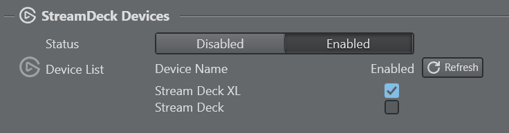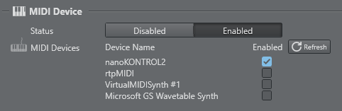 When the configuration window is opened or the refresh button is pressed, Viz Arc scans for connected MIDI devices and displays them as a list of available devices. Check Enabled if you want to use a device in Viz Arc. When checked, the device can be used through scripting identified by the Device Name.