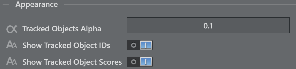 • Tracked Objects Alpha: Sets the transparency of the bounding boxes of the detected objects.
