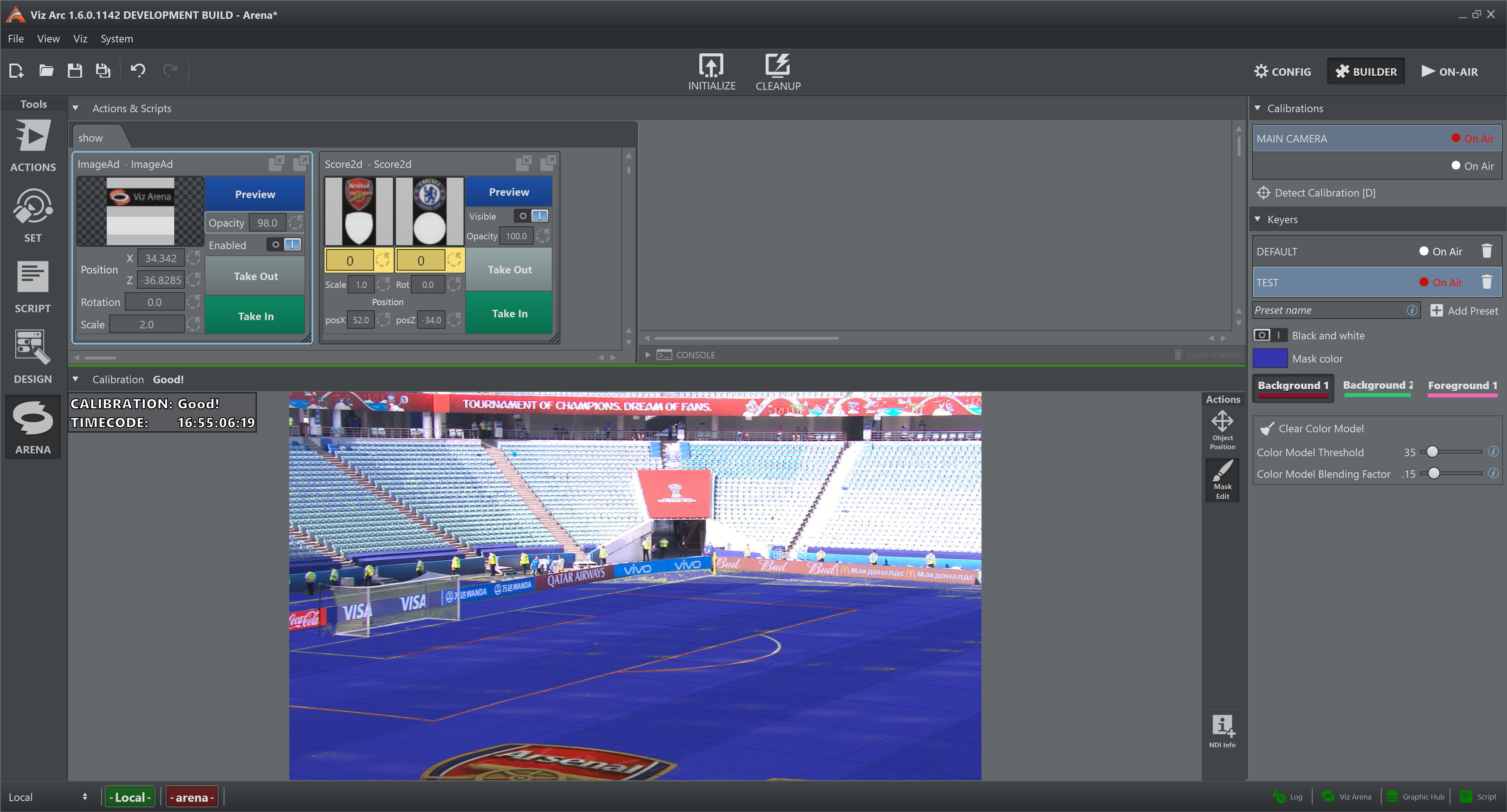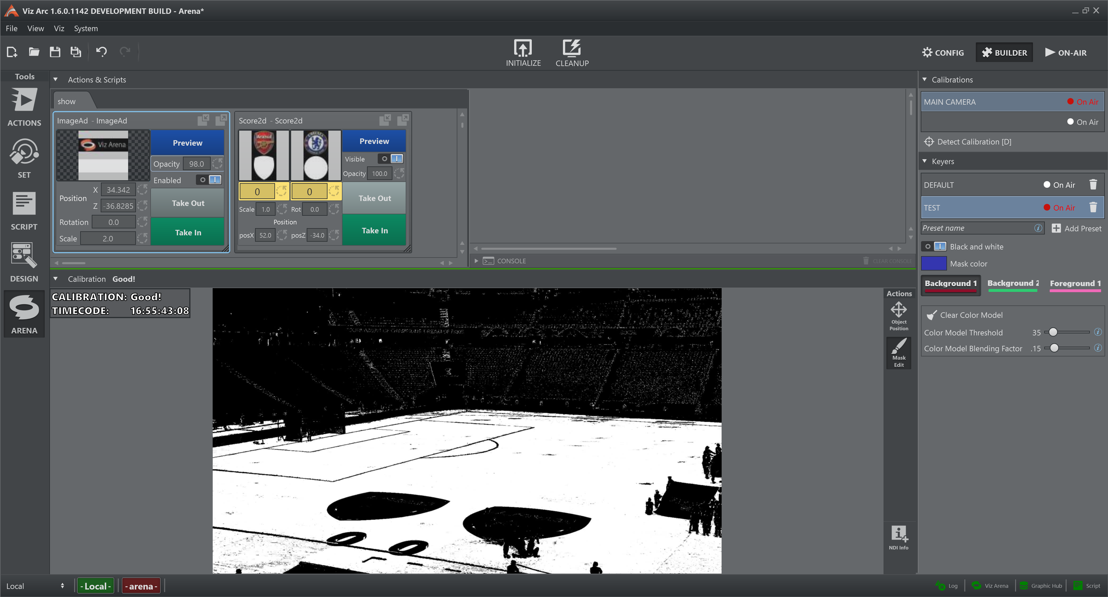 It is possible to toggle between the two modes see Settings panel > Mask > Back and White . During a live game, it is advised to regularly observe the output of the keying mask to ensure that the graphics are well rendered on Viz Engine and to provide the best possible tracking quality.