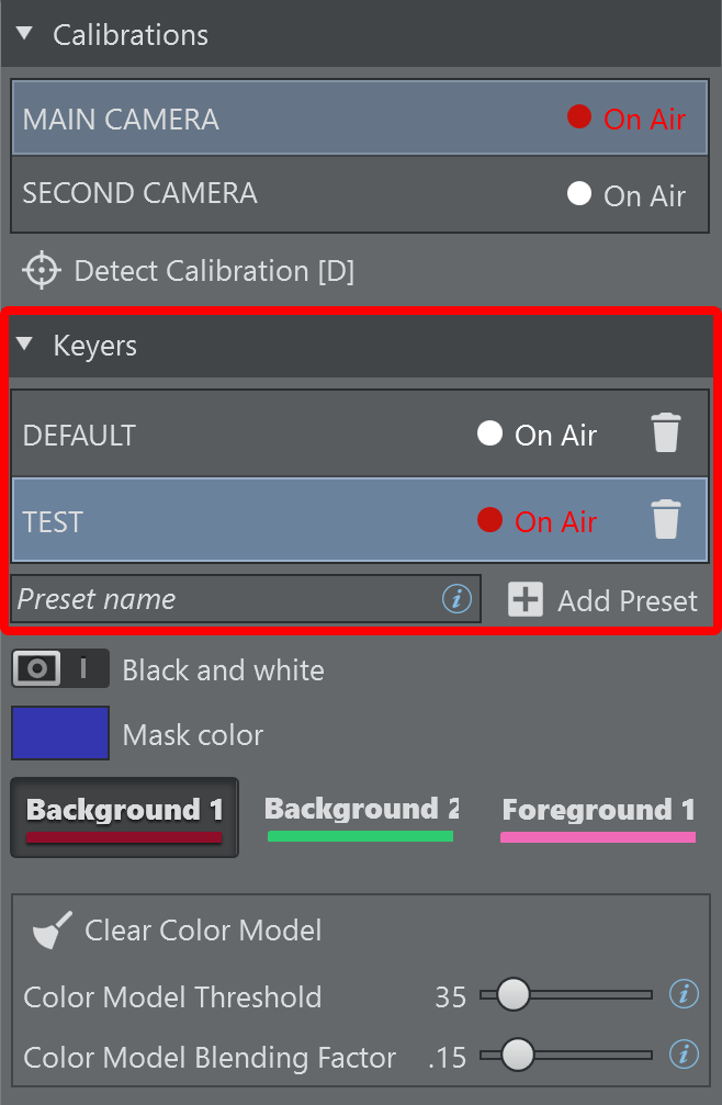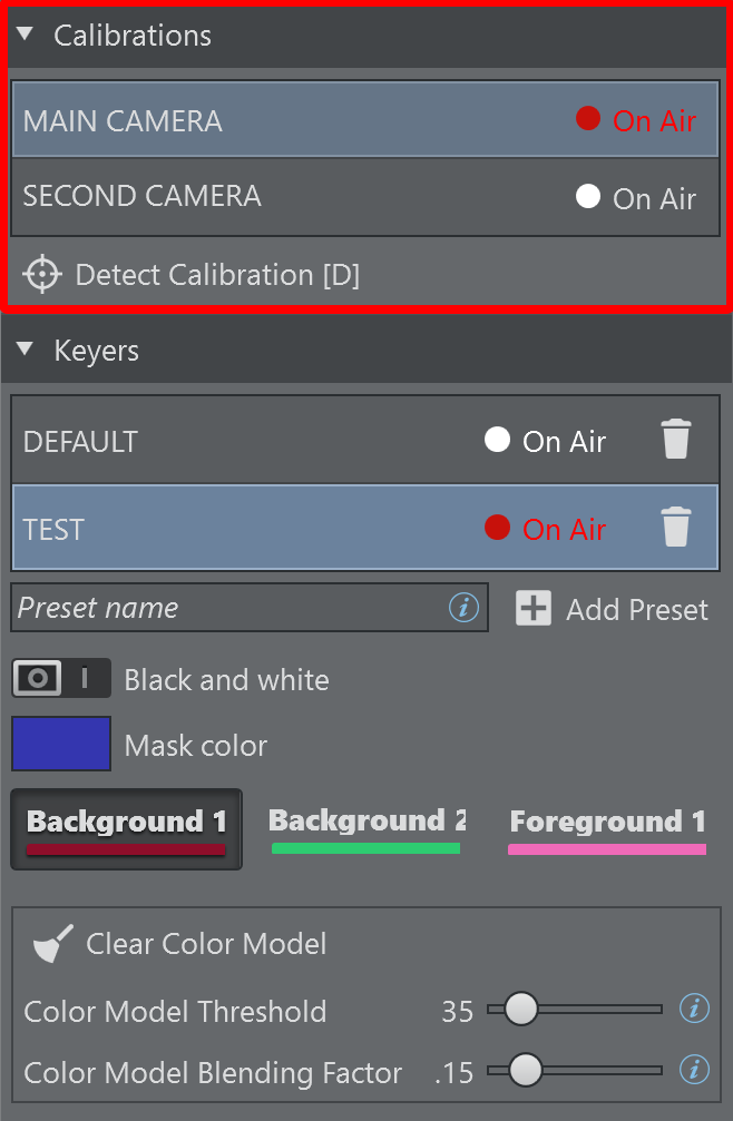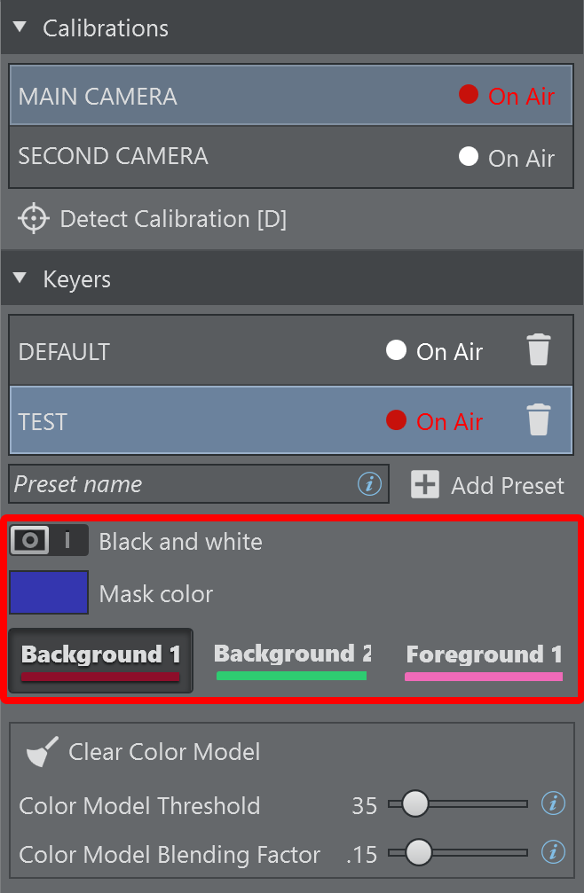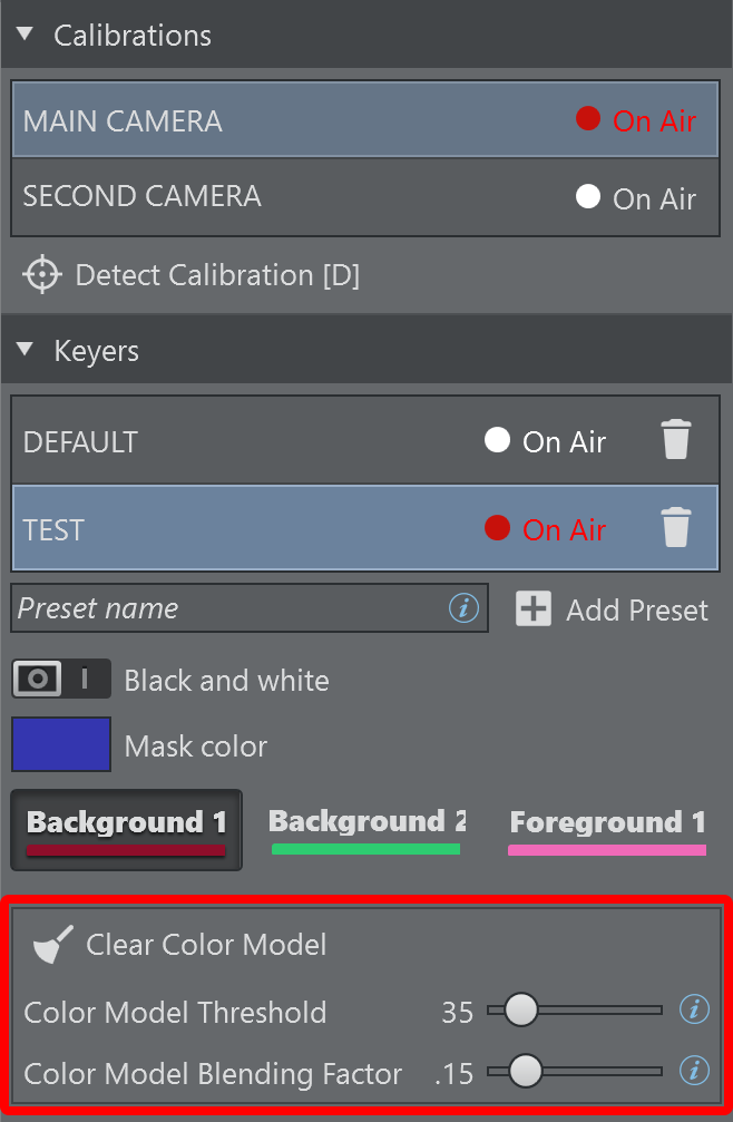Clear Color Model [C]: Clears the stored keying information about the current preset and starts updating the color model from scratch. Alternatively, use the shortcut C on the keyboard.
