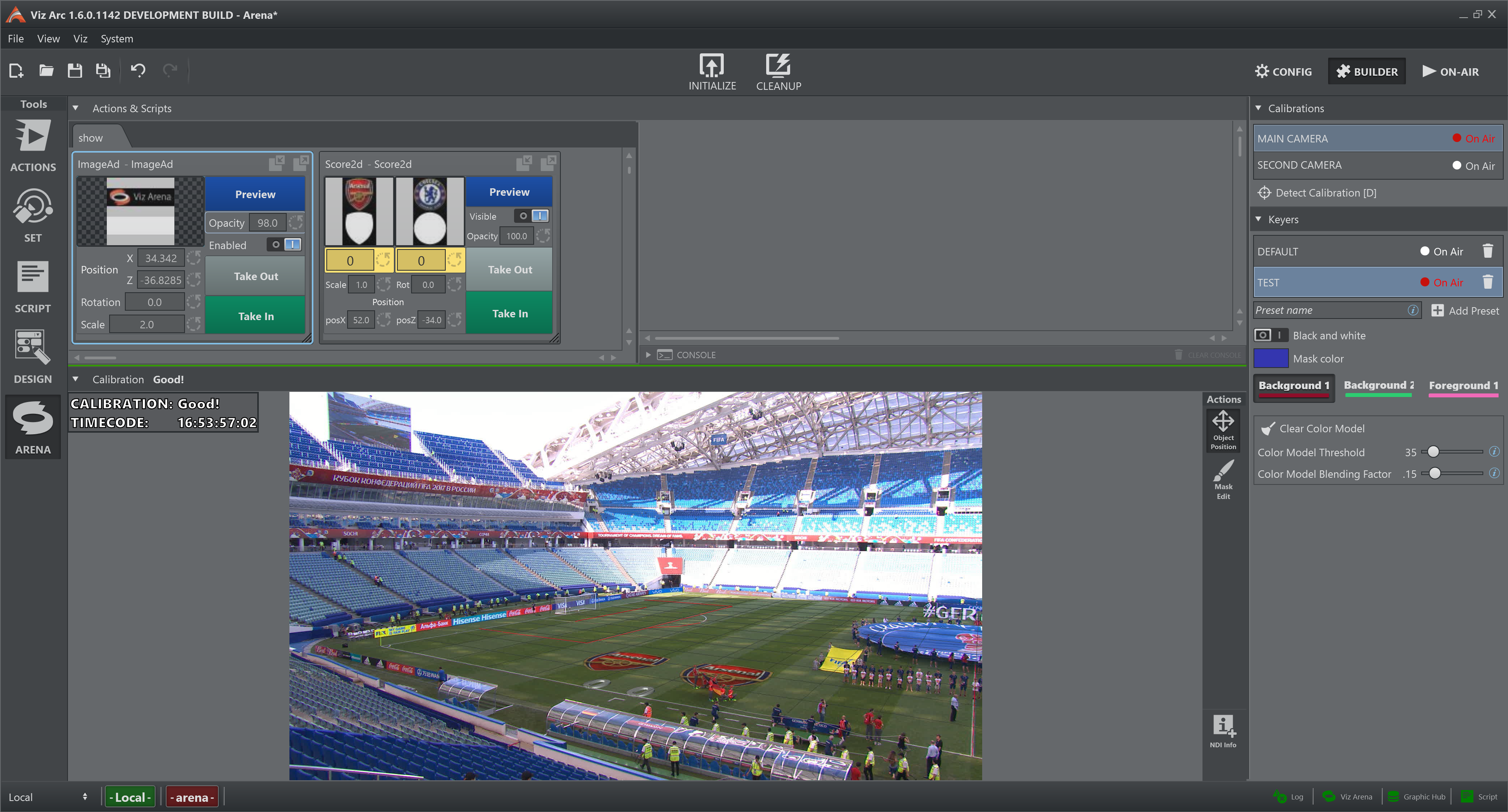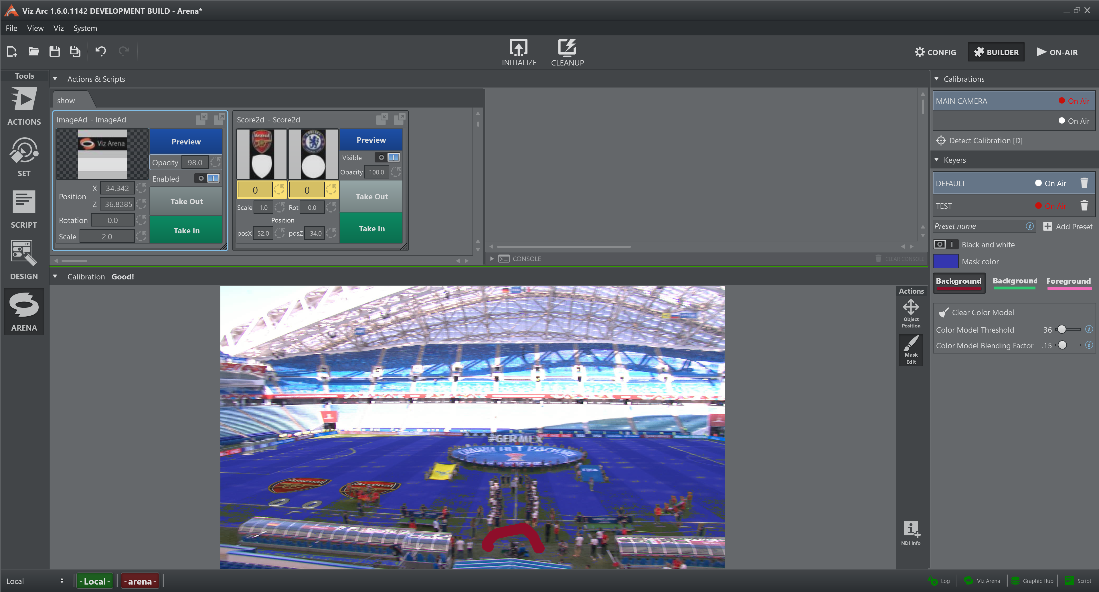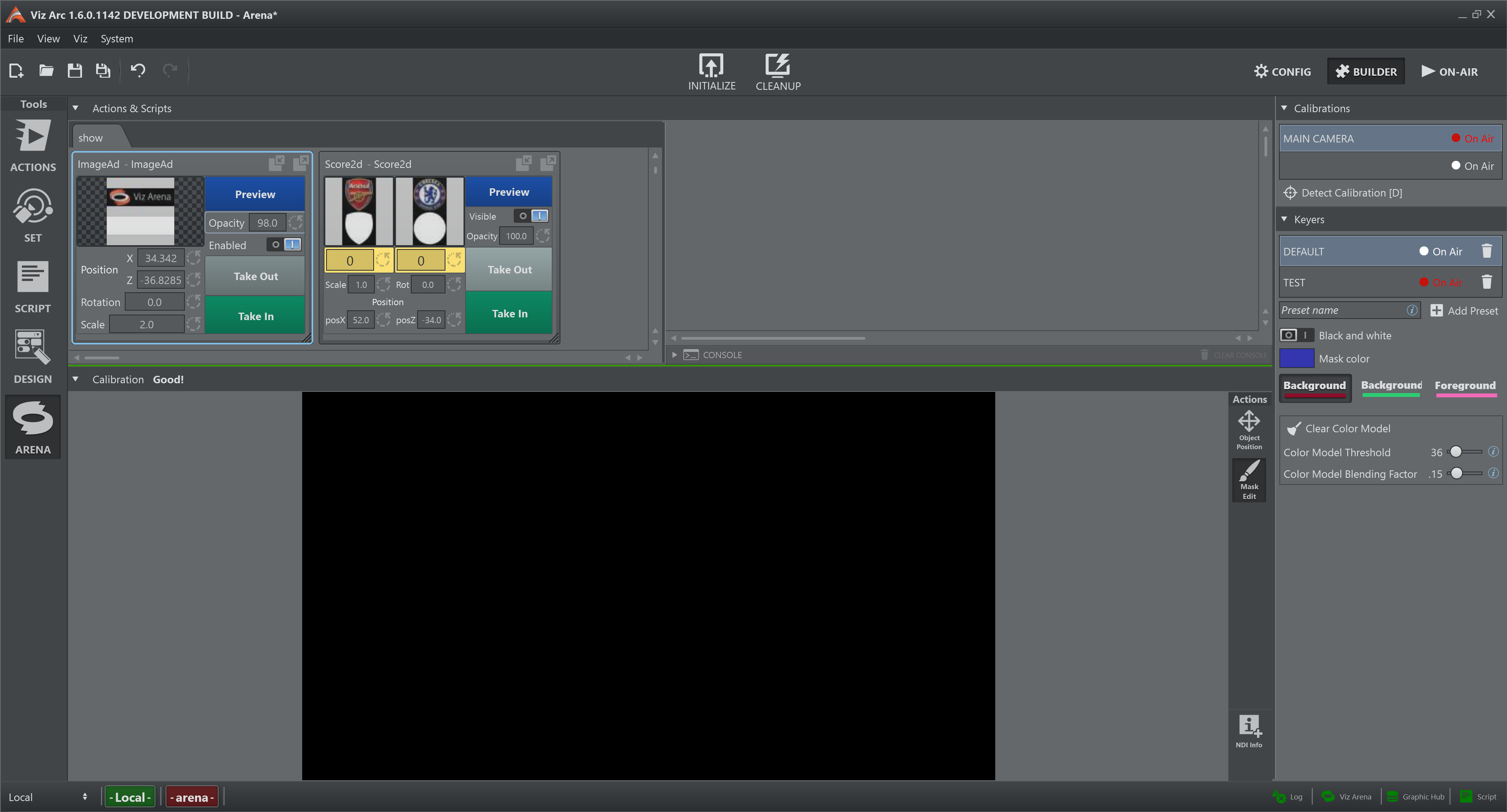 The Output View shows the NDI stream, both video and metadata, provided by Viz Arena. Since it is very important to see any changes of the calibration status, at the very top of the view there is line that show its current value:
