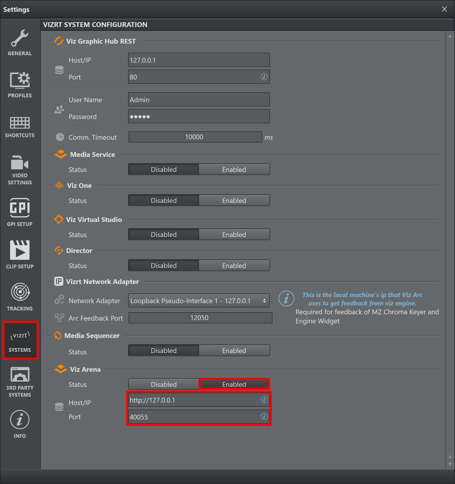 Select the Vizrt System tab and press Enabled on Viz Arena.