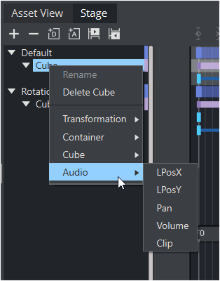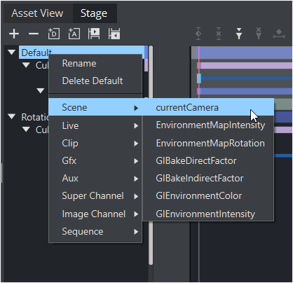 Change one of the selected camera properties and set the next Key Frame. This adds an actor in the Stage Tree for the camera whose properties you have changed. Another way to create camera animations is to enable position and/or direction tracking in the camera editor to animate the camera through a container transformation animation.