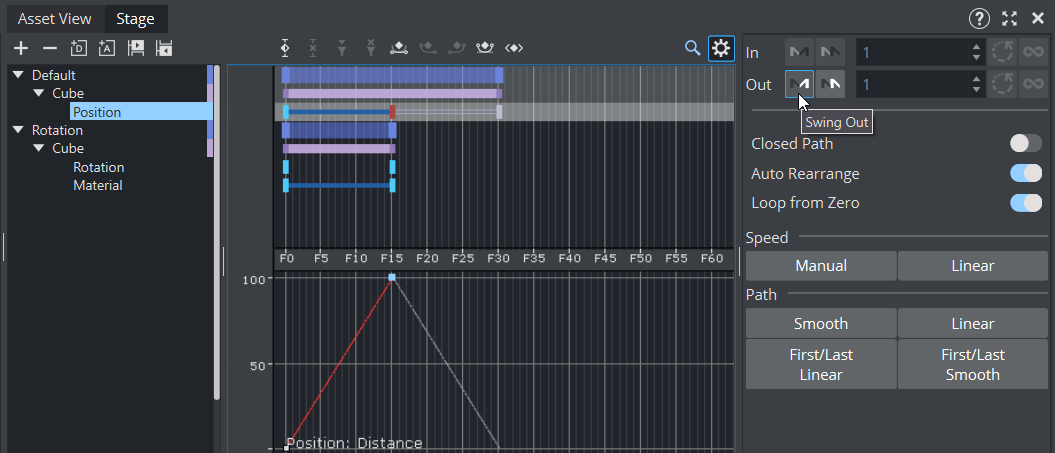 The swing operation makes it possible to repeat the animation of a channel in reverse play either at the beginning or end of the channel time-line.