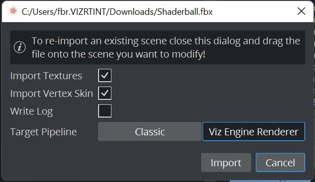 When importing, make sure you select Viz Engine as target pipeline.