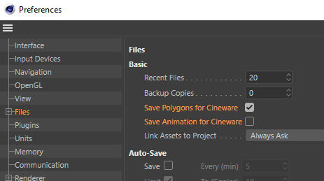To make sure that CINEMA 4D saves all the information Viz Artist requires when importing from .c4d files, enable the following settings in CINEMA 4D’s preferences.