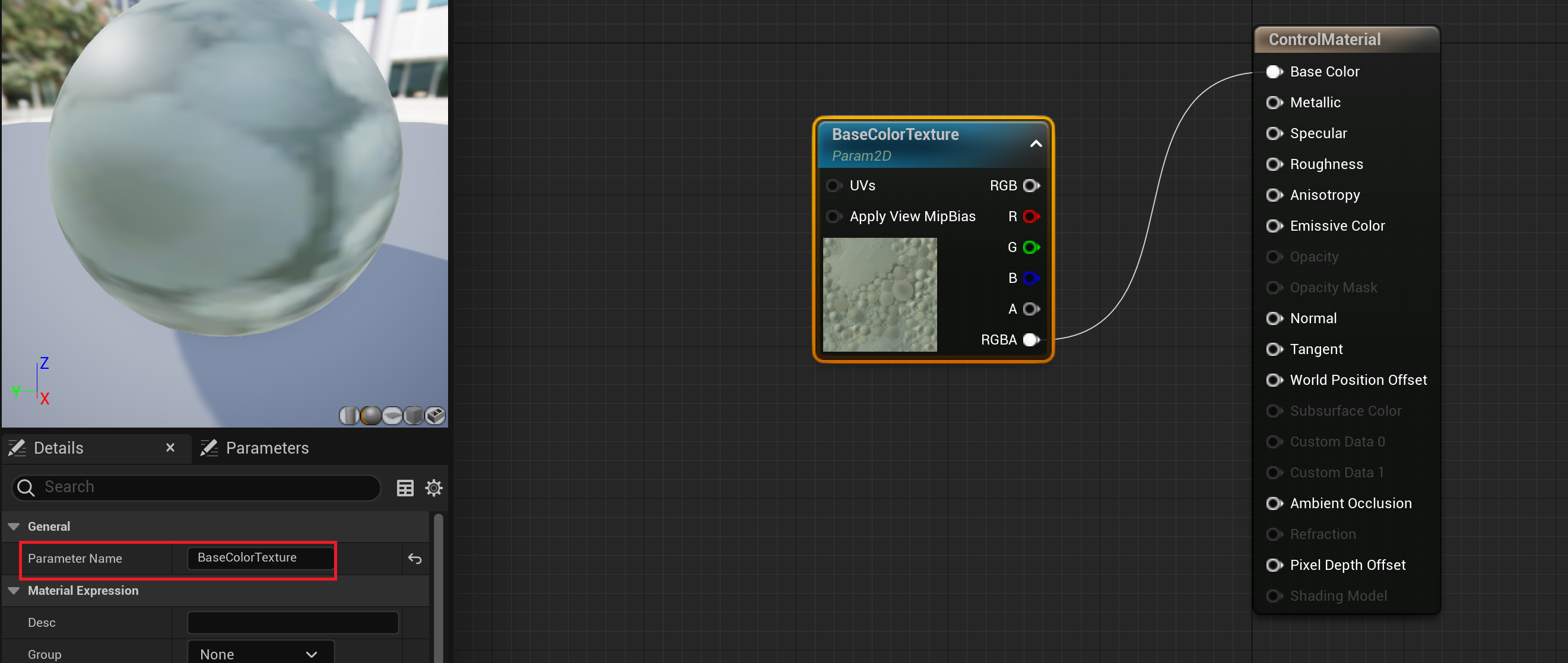 Drag the RGBA node of the parameter and connect it to Base Color in the material.