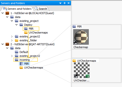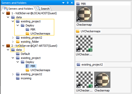 A PBR Material (from data\existing_project\Deploy\PBR) is deployed from Server A (localhost) to Server B (QAT-ARTIST). Project existing_project is set as Source UUID and incoming is set as Target UUID in deploy configuration. The Material itself has a reference to a texture in folder UVCheckermaps and has itself a folderlink to UVCheckermaps. From within Asset view, right click on the item you need to deploy and select Deploy to Target.
