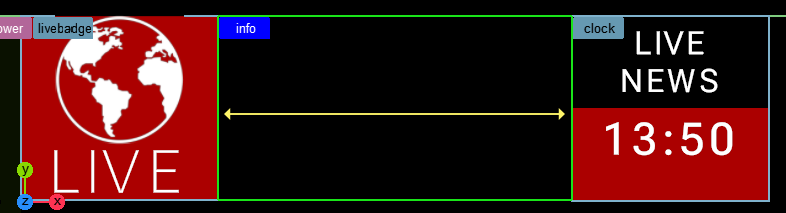 Change the Flex Direction of the lower container to Column. This arranges the livebadge on top, the info next and finally the clock container top to bottom. Remove the paddings of the lower, they are not needed in Portrait mode. The next step is to adjust the live badge: The Flex Direction should also be changed to Row to arrange the world next to the LIVE text. Adjust the width of livebadge to fill the remaining space in our header. The Height should match the Height of our previous Breaking News part.