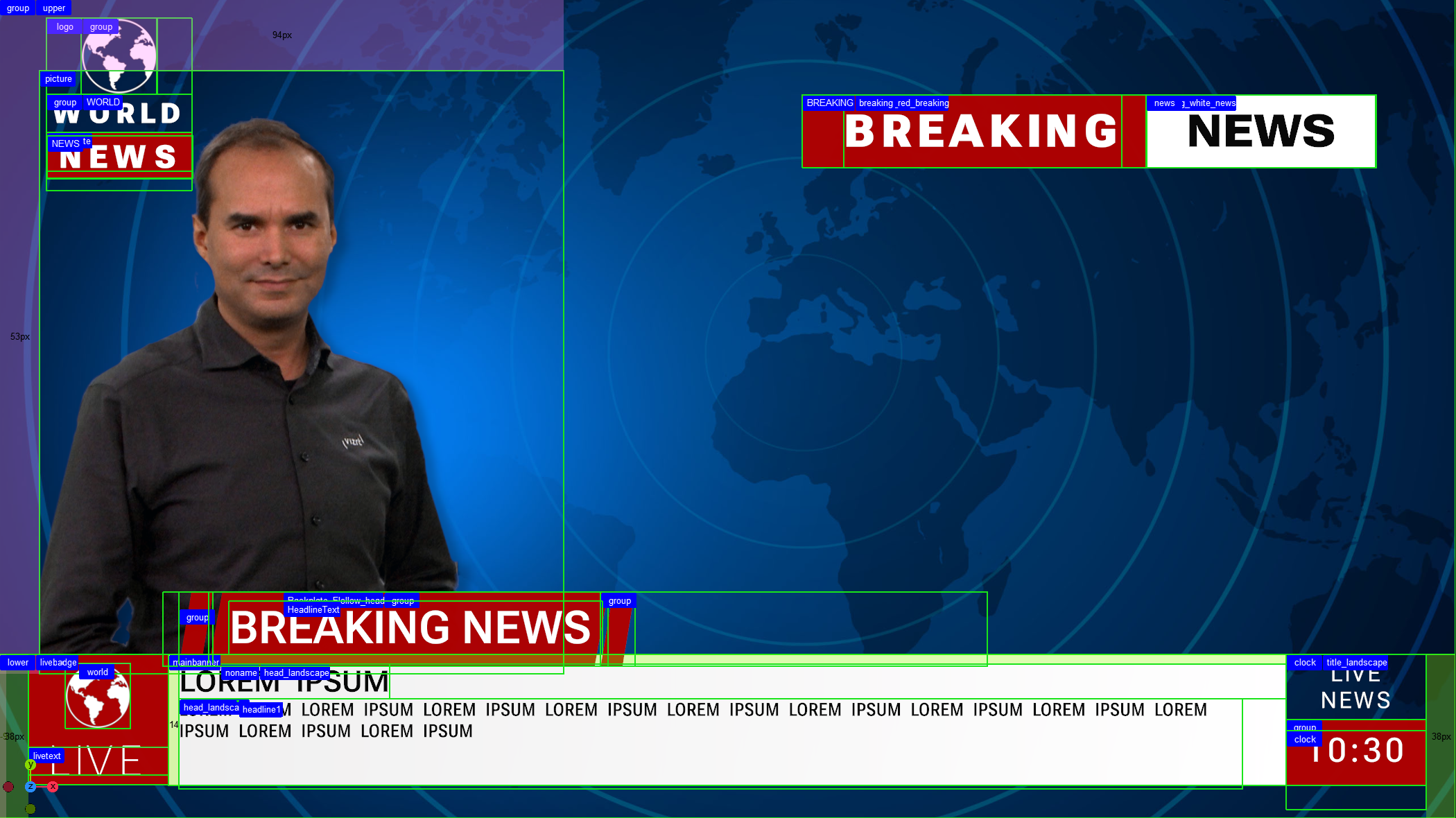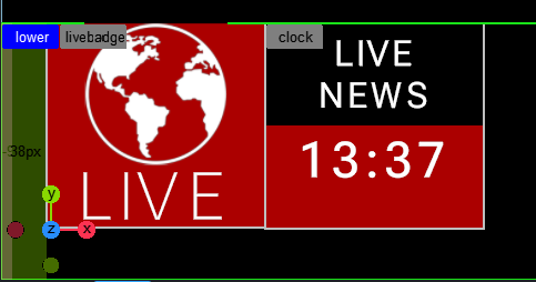 The Over the Shoulder element contains of an additional box, split into two rows. The first one shows a red backplate and the text BREAKING, the second one a white backplate and the text NEWS. As these words are not intended to be changed afterwards, the dimension of the container must not be dynamic. This box is also positioned in absolute mode.