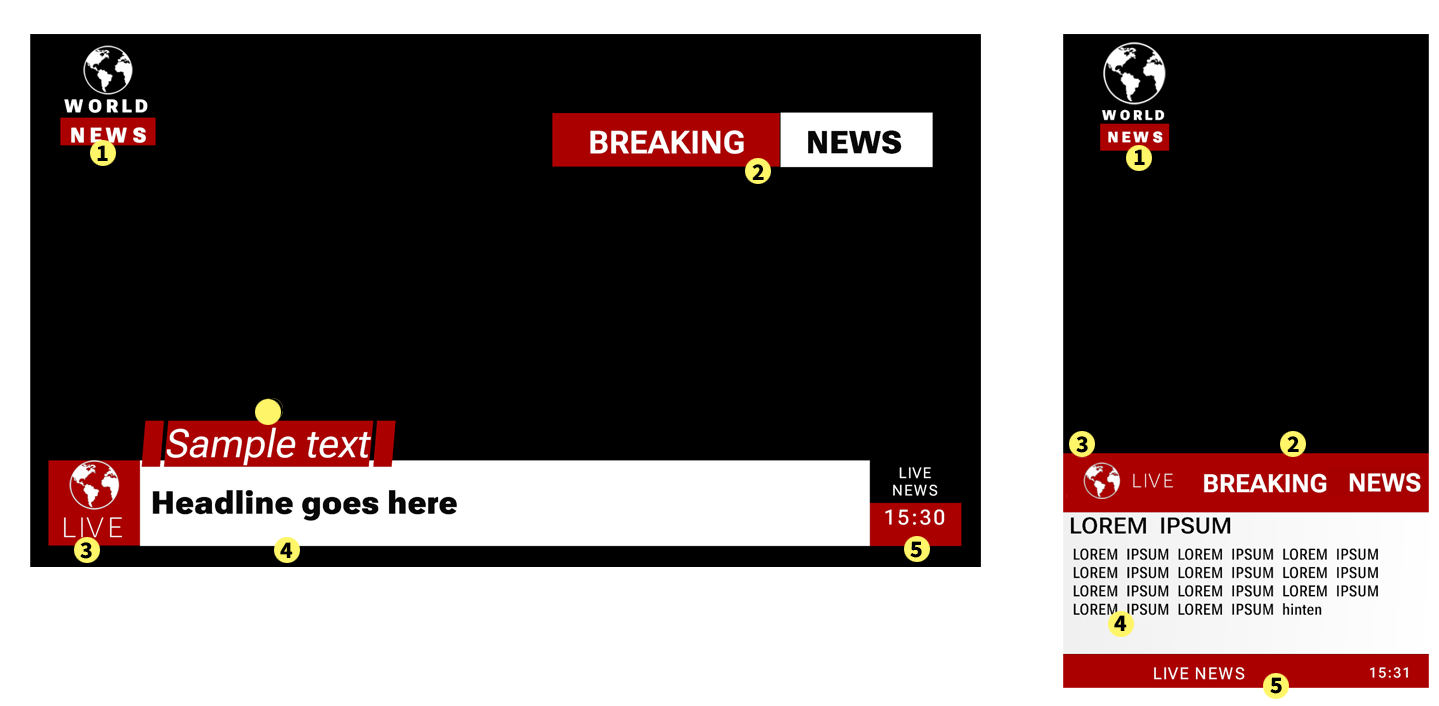 The Logo (1) is more or less the same, the typography is a bit smaller, the logo appears bigger. The Breaking News (2) becomes part of our Footer graphics block, the news part gets a red background instead of white. The Live Badge (3) becomes part of the Footer graphics block too. The information text (4) gets a smaller headline font, the infotext has more lines to fit in its information. Finally the Clock and Title (5) goes into the last part of the footer graphics.