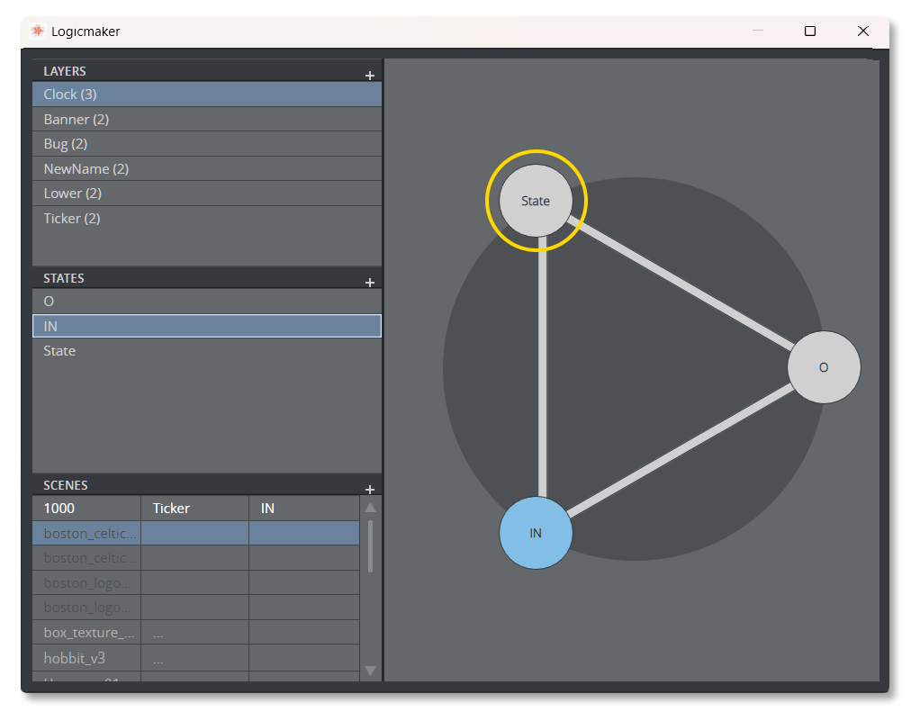 Tip: States refer to points in a scene, for example start, pause or end points. Typically, a scene has two states: an Out (O) state, where a toggle layer is no longer visible on the screen; and an In (I) state, where the toggle layer is visible on-screen.