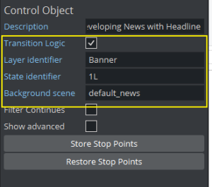 A valid scene has a control object plug-in assigned, Transition logic enabled, a valid Layer identifier, a valid state identifier and a Master or Background scene.