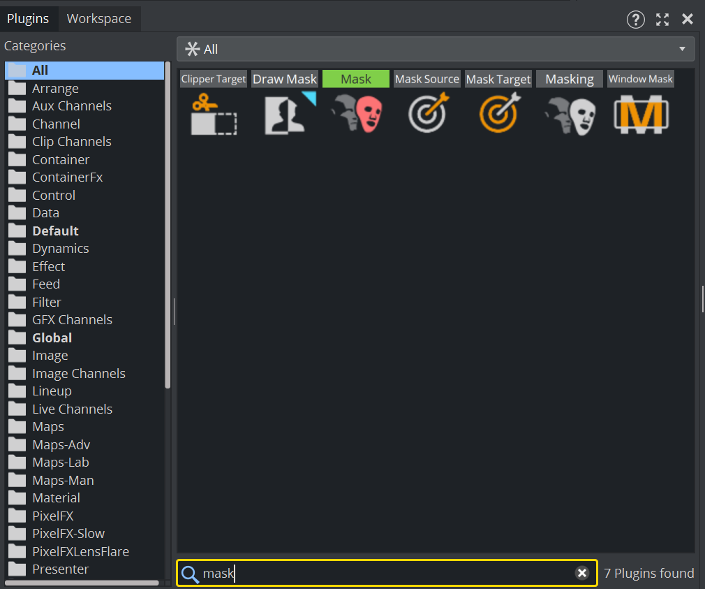 The search field on the bottom of the Plugin panel allows to do a free text search for all kind of plug-ins. For example, if you want to add a Rectangle plug-in, simply start typing Rect and only plug-ins with rect in their name are displayed.