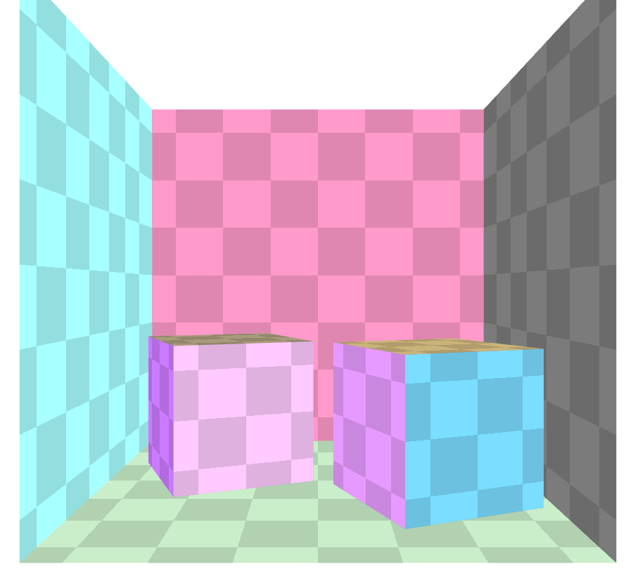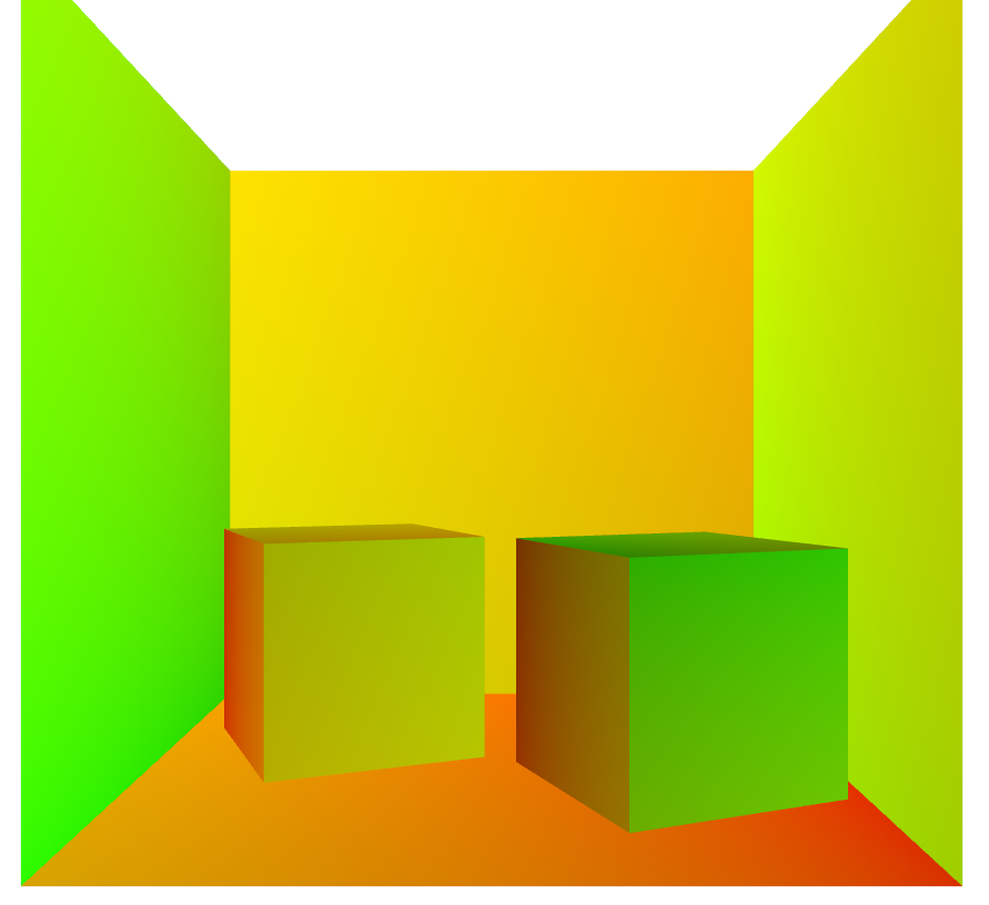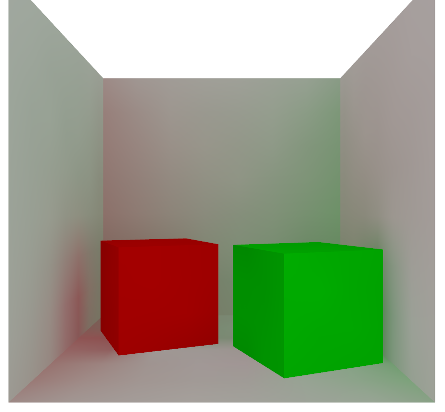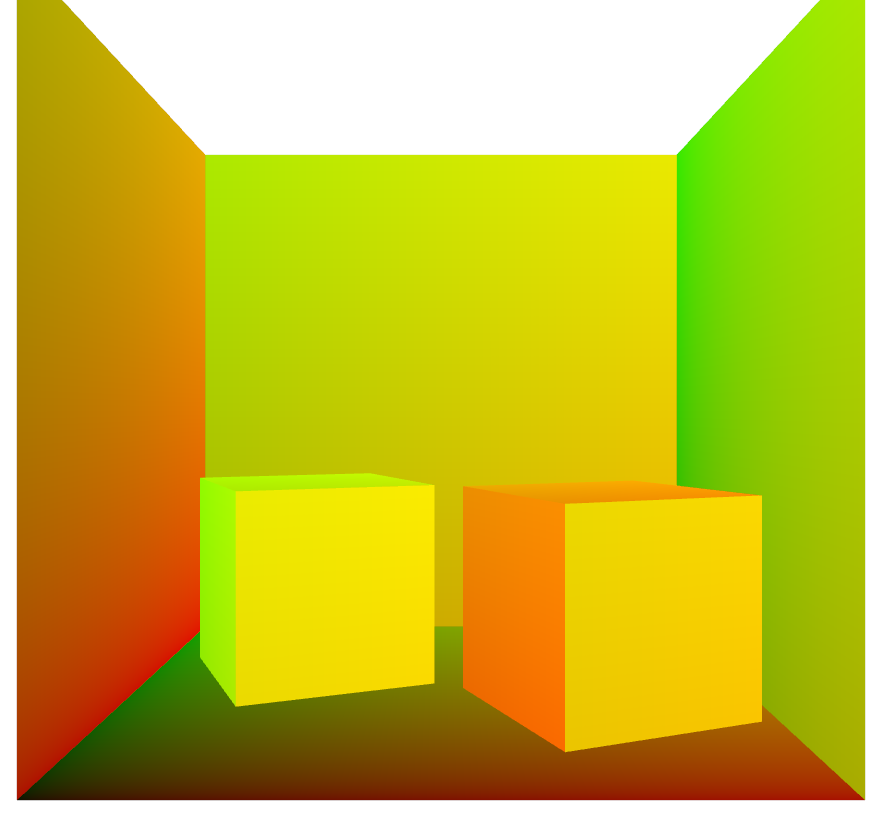 All the light setups, color, type, transformation, can be done at any time now, without a need to recompute the whole scene. This is the benefit of working with lightmaps. It is very important to increase the radiosity setting of the lights that light up the whole scenery, using the Light Editor. Be aware that Lightmaps are static maps that react in real time to the GI parameters. They are not dynamically calculated with animations. When you have an object, like the Cornell box example above, and animate the rotation of one of the cubes inside the Cornell box, you see the wrong colors reflected during the rotation. This is because the lightmaps are statically projected onto geometries. When rotating the middle cube of the Cornell Box example, which is receiving a green color from the green wall next to it, it does not turn red when rotating to the other side, because lightmaps are static. The same applies to Ambient Occlusion maps. Whenever you want to animate an object, you should not compute the lightmaps or Ambient Occlusion maps for it, as otherwise the result does not look correct. If an object is hidden in the Scene Tree, it is not calculated with GI.