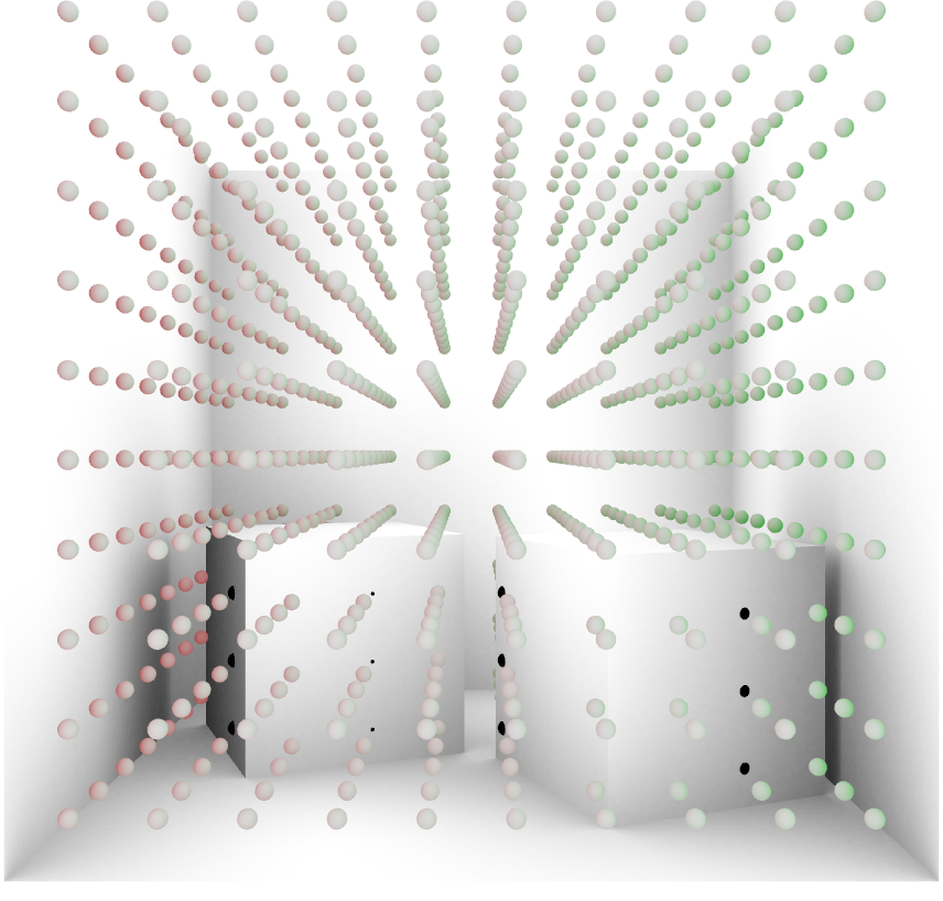 Enable or disable debug view for the light probes inside your set. The light probes provides you with a visual representation of how light is distributed within your scene. The Size parameter adjusts the size of the light probes in the viewport, but does not influence computation of the Lightmaps or light probes themselves.
