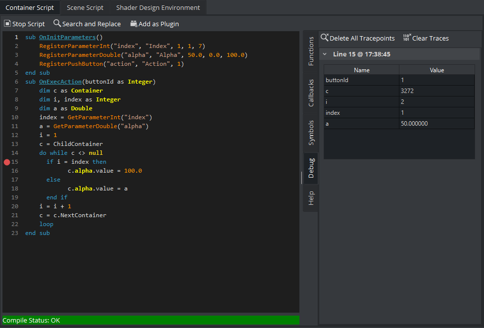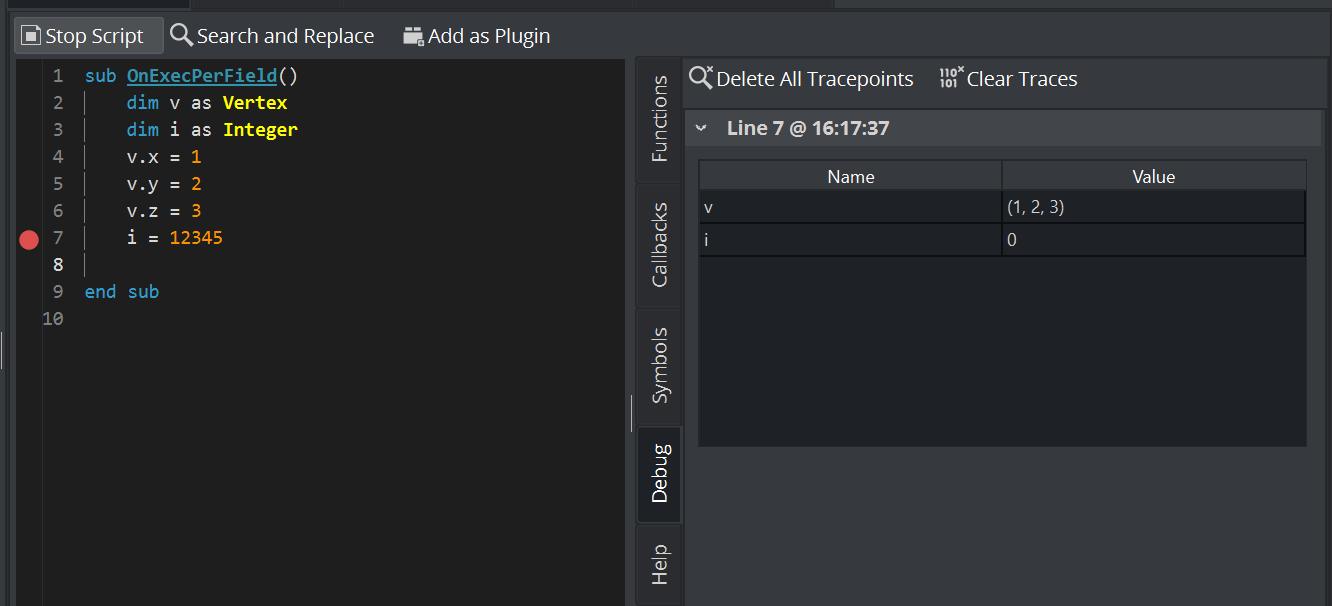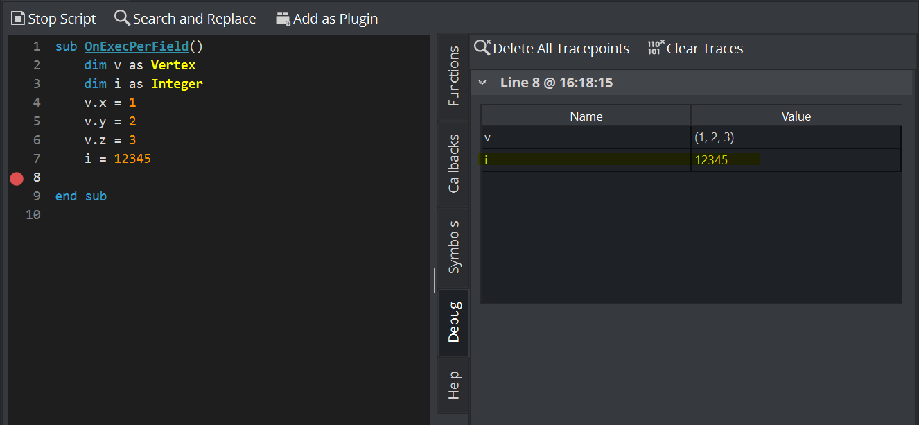 The script editor supports setting tracepoints which provide insights into the state of the variables at a certain point of the execution.