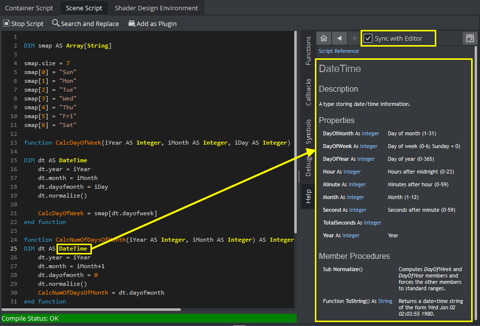 Tip: Sync your documentation view with the script editor. Click on a keyword within the editor and the Scripting Reference automatically shows you the correct chapter within the scripting documentation. For example, if you click on "scaling", the Script reference automatically shows you the chapter about scaling, as in the screenshot below: