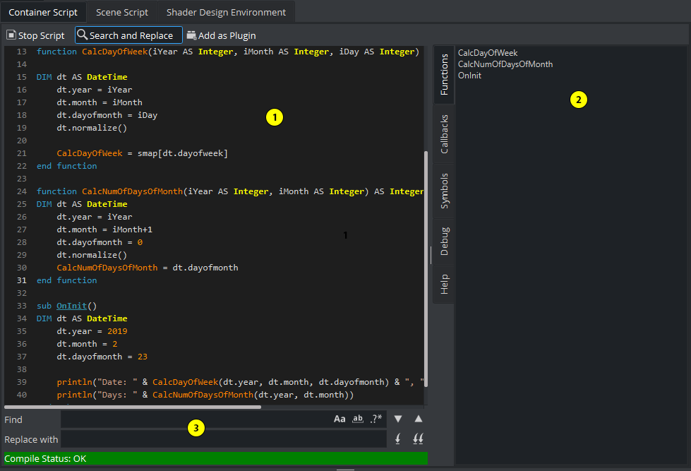 To toggle between run mode and edit mode, click on the respective the button. A script that has been successfully compiled and runs without any errors, can be saved as a Script plug-in. This is done by clicking on the button. For more information, please see chapter Create Script-based Plug-ins. The status of the compile status is shown under the editor area: