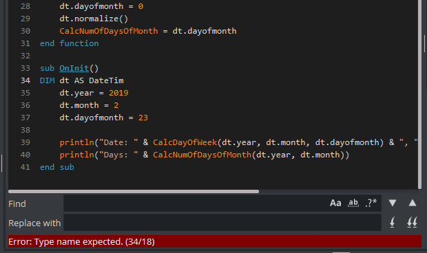 To start editing your script, start by typing one of the keywords, for instance dim or Sub. The Editor automatically offers you a list of possibilities and auto-completes your selection. Example: Start adding a new sub by typing Sub O. A list of valid options immediately shows up:
