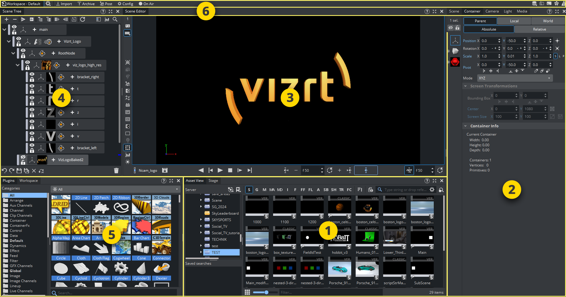 2 | Properties | Properties for Containers, Cameras, Lights and Video Clip Playback Considerations are controlled from the Property panel, where size, position and other settings can be modified as required. |