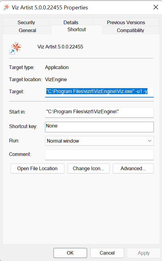 Right click the Viz Artist shortcut under the Windows Start menu and select Properties in the context menu.