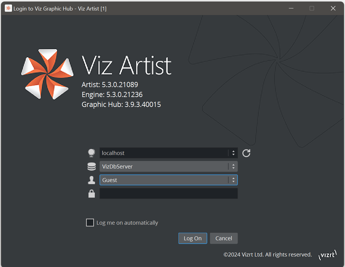 To use Viz Artist, a connection to a Graphic Hub needs to be established. See Working with Graphic Hub for details.