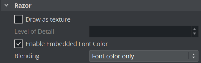 Draws the text with Razor method on a temporary offscreen texture before drawing it back into the scene. This option helps increase performance, in exchange for lower rendering quality of the text. The Level of Details option can be used to control how detailed the texture should be.