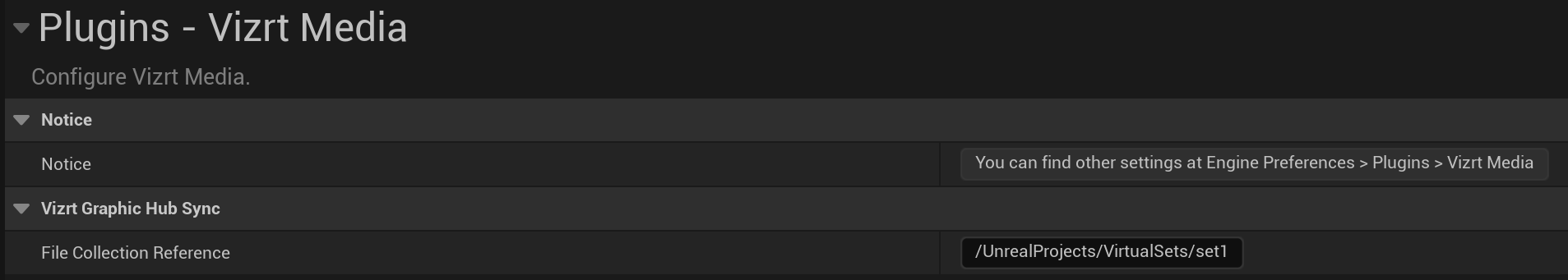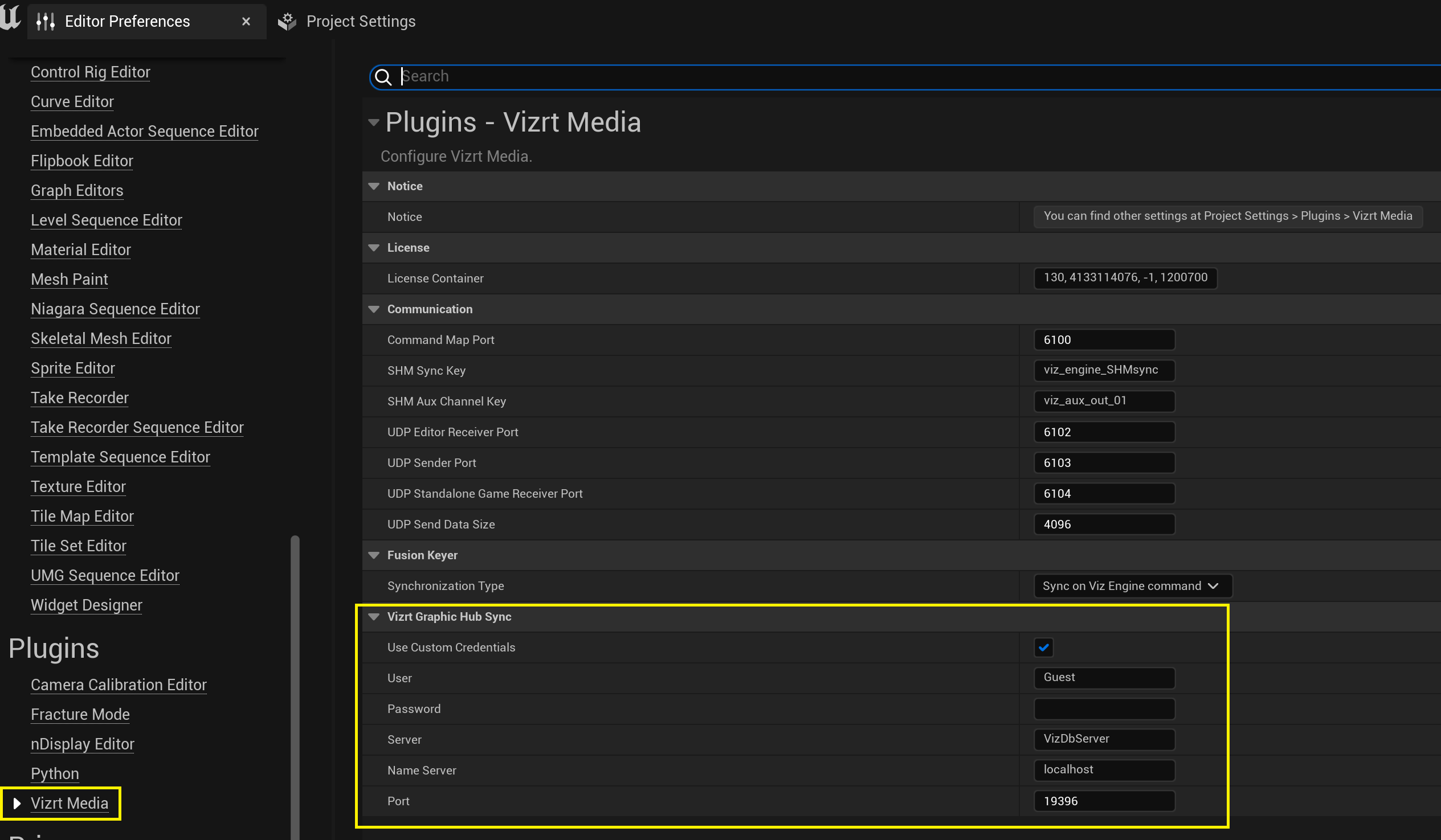 Go to Settings > Project Settings. Navigate to the Plugins > Vizrt Media section.