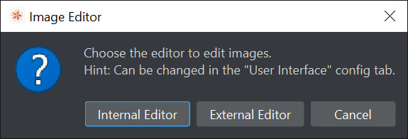 If this is done the first time, a Dialog pops up to ask if images should generally be opened in the external or internal Image Editor. This is saved as the default double click action for images.
