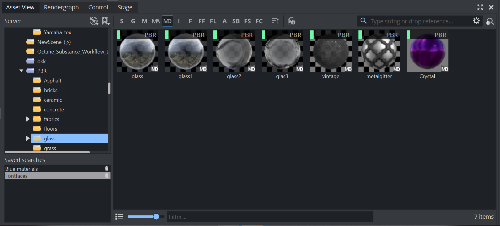 PBR Materials can be stored as Material Definitions on Graphic Hub. This means you can build your own library of pre-defined PBR Materials on your Graphic Hub. To store PBR Materials as Material Definitions, drag and drop them from the Scene Tree to your Server view and give them a proper name. PBR materials are labeled with PBR on top: