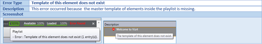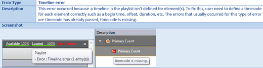 Error state: The state of an element where it has been set incorrectly and cannot be played. Elements in error are shown in Red and will also have a tool-tip indicating what caused the error, if the error condition provides this information, which most errors do.
