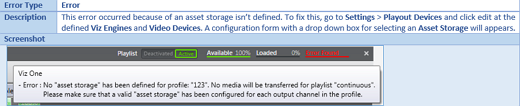 Viz One specific errors: A Viz One Error is an error related to an asset storage. There are specific details on the solution in the tooltip.