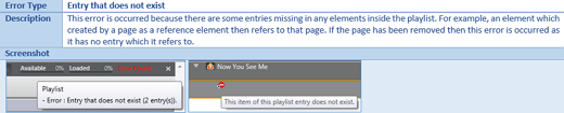 Playlist Errors in the playlist will most likely stop the playlist instantly or make the playlist work incorrectly. All indicated errors should therefore be treated as severe. The cause of the error must be investigated and corrective action must be taken to prevent the error from happening again. Errors can occur if the playlist was set incorrectly, if the elements residing in the playlist aren’t created correctly, or as a result of other circumstances. Errors are separated into six groups as shown in the list below. There is one additional error type if the MAM system Viz One is enabled: