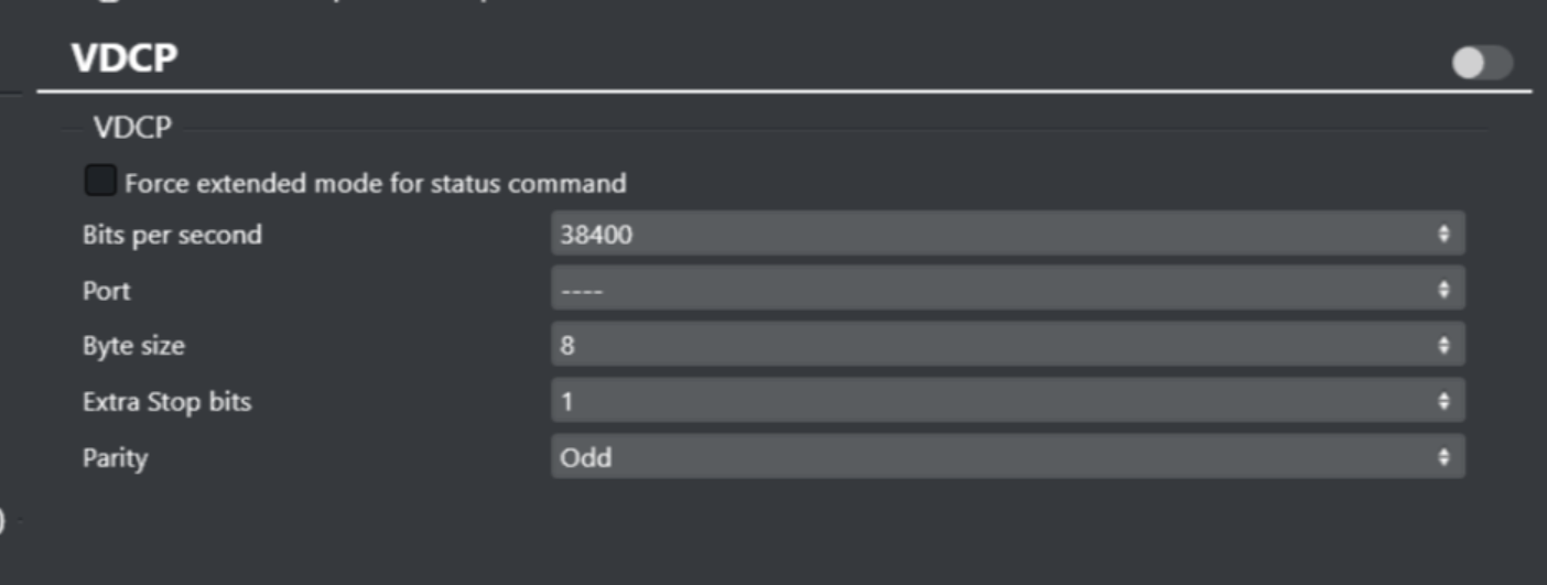 Force extended mode for status command: If checked, all IDs longer than 8 characters in "PORT STATUS REQUEST" and "SYS STATUS REQUEST" VDCP commands will be included.