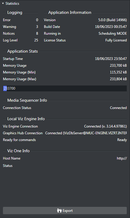 The Statistics panel is an overview dashboard, seeing run-time information and general connectivity status.