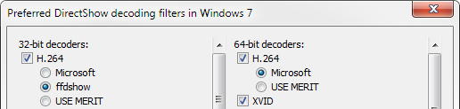 The example below sets up support for h.264 playback using the FFDShow MPEG-4 codec package and a Matroska Splitter from Haali.