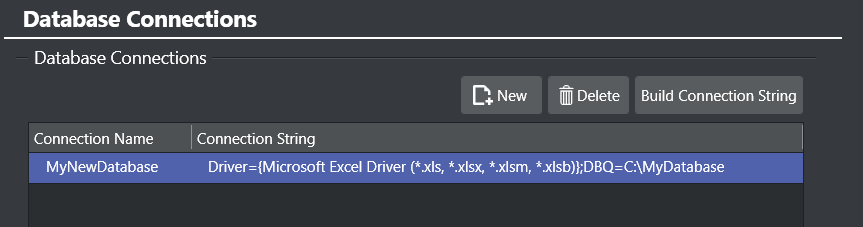 New: Allows you to manually enter a connection string. Clicking New adds a new entry to the list of available connections.