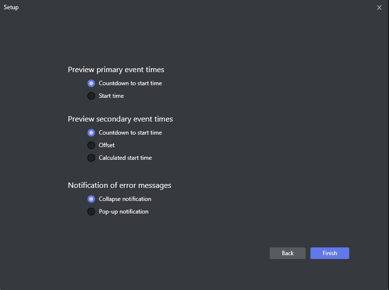 Decide how to present starting time and notifications from the Preview Settings menu.