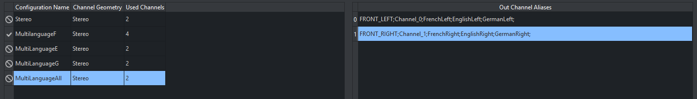 FRONT_LEFT;Channel_0;FrenchLeft;EnglishLeft;GermanLeft;FRONT_RIGHT;Channel_0;FrenchRight;EnglishRight;GermanRight;In the Channel 2 field, add the aliases FrenchRight, EnglishRight and GermanRight.