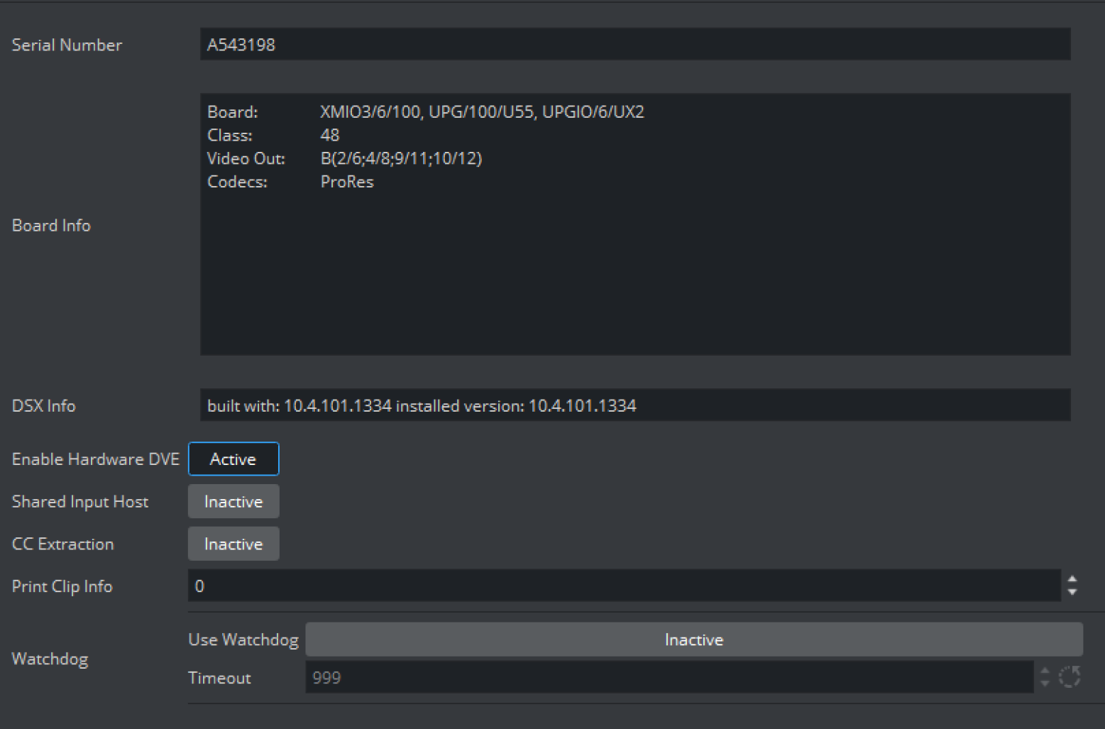 Watchdog: Sets a timer that allows a system to continue video pass-through during an application crash or system failure (see also Watchdog (Matrox X.mio3 Series) and Video Board):
