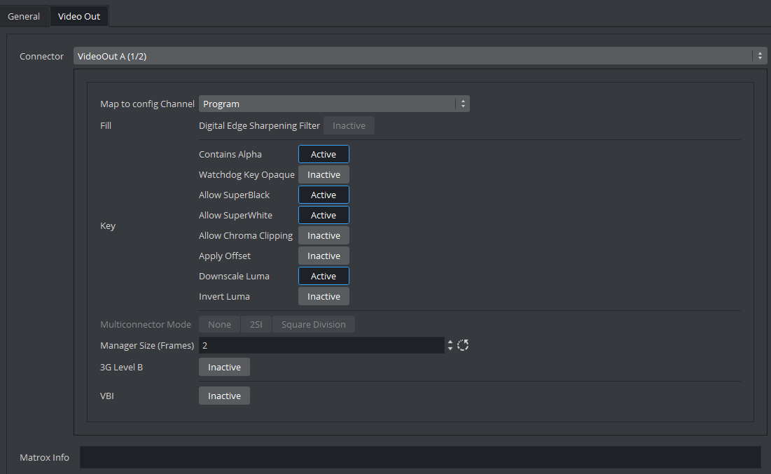 Navigate to Config > Matrox > Video Out for an overview showing which I/O channels are used for fill and key:
