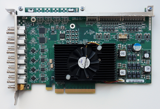 The X.mio3 can be ordered in two configurations: FH (full height, 12 physical HD-BNC connectors, plus one connector for sync) and LP (low profile, eight physical HD-BNC Connectors, plus one connector for sync). Both are half length PCI express Gen2 x8 cards.