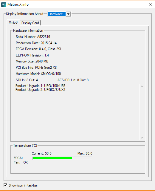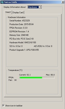 The Matrox X.info utility is used to display information about the card class, how the Input and Outputs are configured, serial number and more. This utility can normally be started from the Windows taskbar. A typical information window would be: