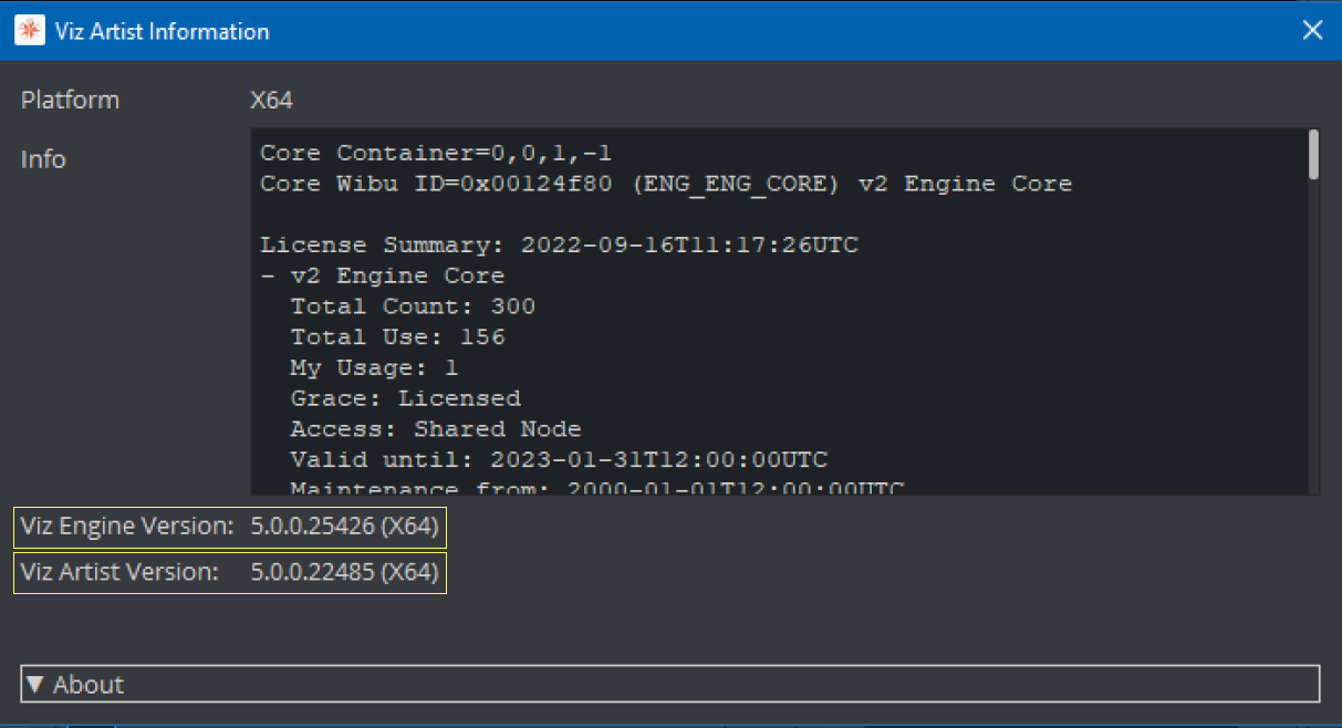 To check the installed version of Viz Artist and Viz Engine, click on the Viz Artist Information button: