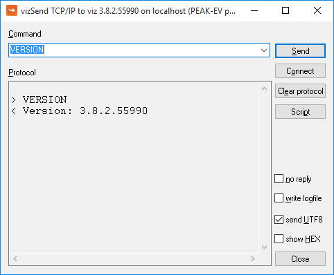 External Commands can also be sent manually to Viz Engine through the console window, using the send command. External commands range from loading a scene and taking the scene On Air, to shutting down Viz Engine. To issue a command to the Engine, open the console window and type send [COMMAND], then press enter. For example, the command VERSION can be used to display the current Viz version and build number: send VERSION CONSOLE: answer <Version: 3.8.2.55990>